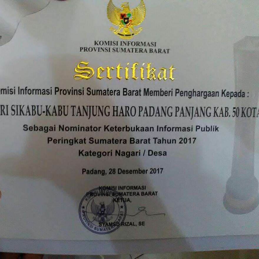 Foto : (Bupati Limapuluh Kota "Kiri" Wali Nagari Tj.Haro Sikabu-kabu Pd.Panjang "Kanan") Penerimaan piagam penghargaan TRANSPARASI INFORMASI BADAN PUBLIK TINGKAT PROPINSI, kategori pemerintah kab / kota diraih oleh Kab 50 kota sebagai peringkat 5, dan kategori pemerintah nagari daraih oleh nagari Tj haro, sikabu pd pjg sebagai peringkat 4 dari 825 nagari.