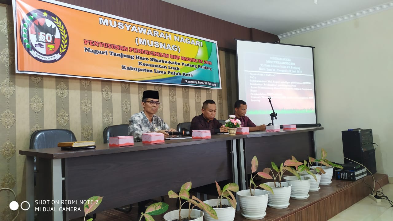 Pemerintahan Nagari.TSP-| Badan Permusyawaratan Nagari (BAMUS) melaksanakan Musyawarah Nagari (MUSNAG) dalam rangka penyusunan perencanaan Rencana Kerja Pemerintahan Nagari Tj.haro Sikabu-kabu Pd.Panjang tahun anggaran 2020 yang di hadiri oleh LPM, KAN, Karang Taruna, Kepala Jorong, Tokoh Adat, Tokoh Agama, Tokoh Masyarakat, Tokoh Pendidikan, Kelompok Tani, Kelompok Pengrajin, Kelompok Perempuan, Kelompok Seni Budaya, Badan Usaha Milik Nagari, Kader Posyandu/KB, Kelompok Masyarakat Miskin dan umumnya Masyarakat Nagari Tj.Haro Sikabu-kabu Padang Panjang yang bertempat di Ruang Pertemuan Nagari pada hari Jum'at tanggal 28 Juni 2019.