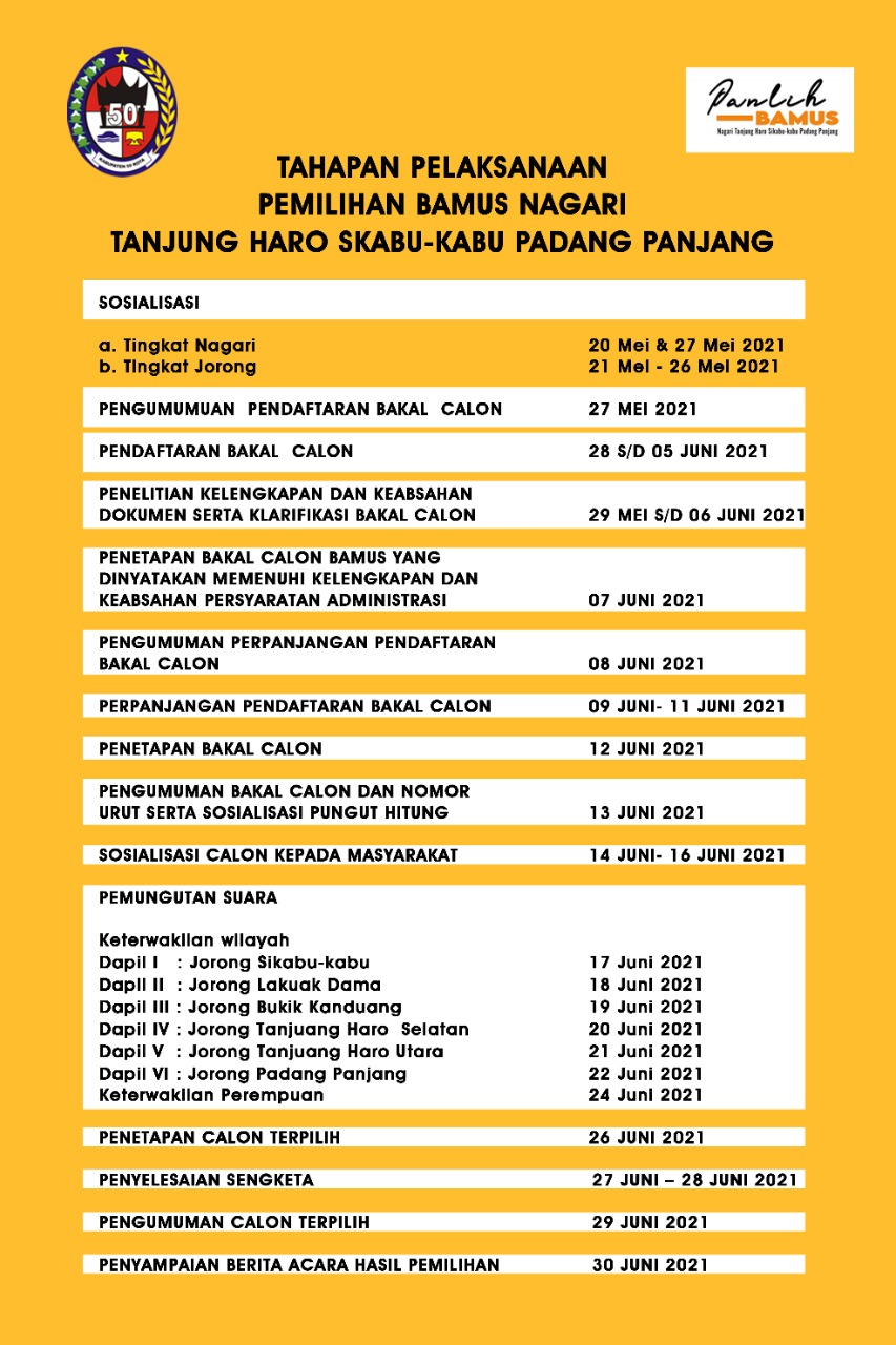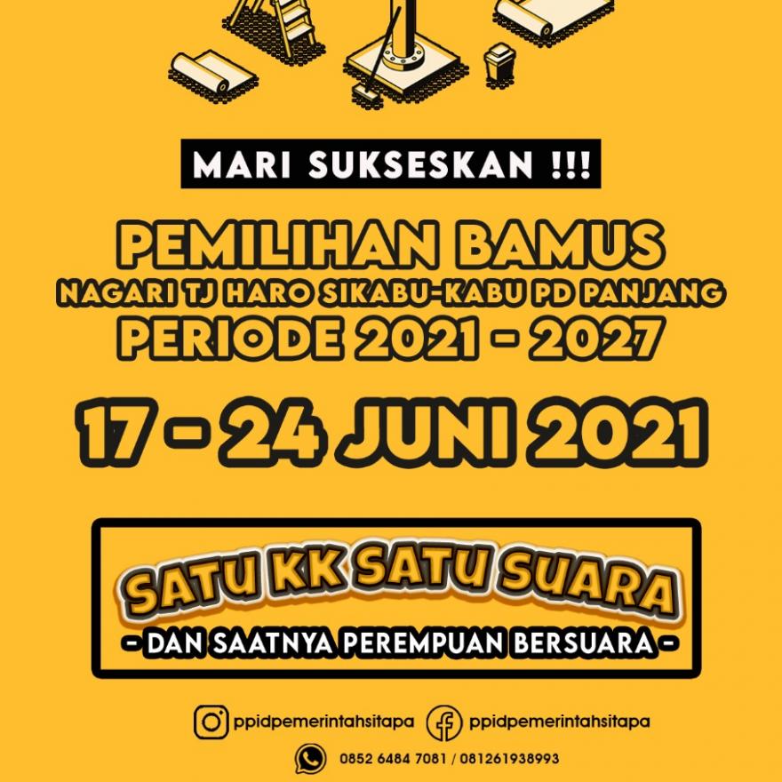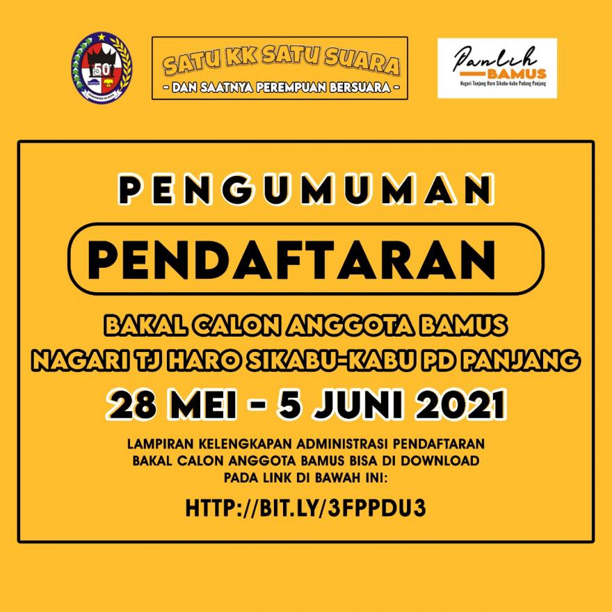 Warta Nagari -- Dalam rangka pengisian Anggota Badan Permusyawaratan (BAMUS) Nagari Tanjung Haro Sikabu-kabu Padang Panjang Periode 2021-2027, Panitia Pemilihan Badan Permusyawaratan Nagari Tanjung Haro Sikabu-kabu Padang Panjang berdasarkan Peraturan Menteri Dalam Negeri Nomor 110 Tahun 2016 tentang Badan Permusyawaratan Desa membuka kesempatan bagi Warga Nagari Tanjung Haro Sikabu-kabu Padang Panjang yang memenuhi persyaratan untuk mendaftarkan diri sebagai bakal calon anggota Badan Permusyawaratan Nagari.
